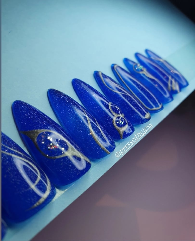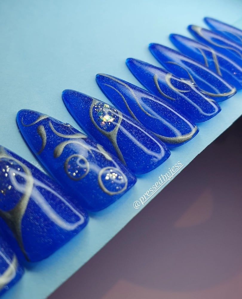 Dark blue jelly base with sparkles, silver chrome detailing with 3D elements.
